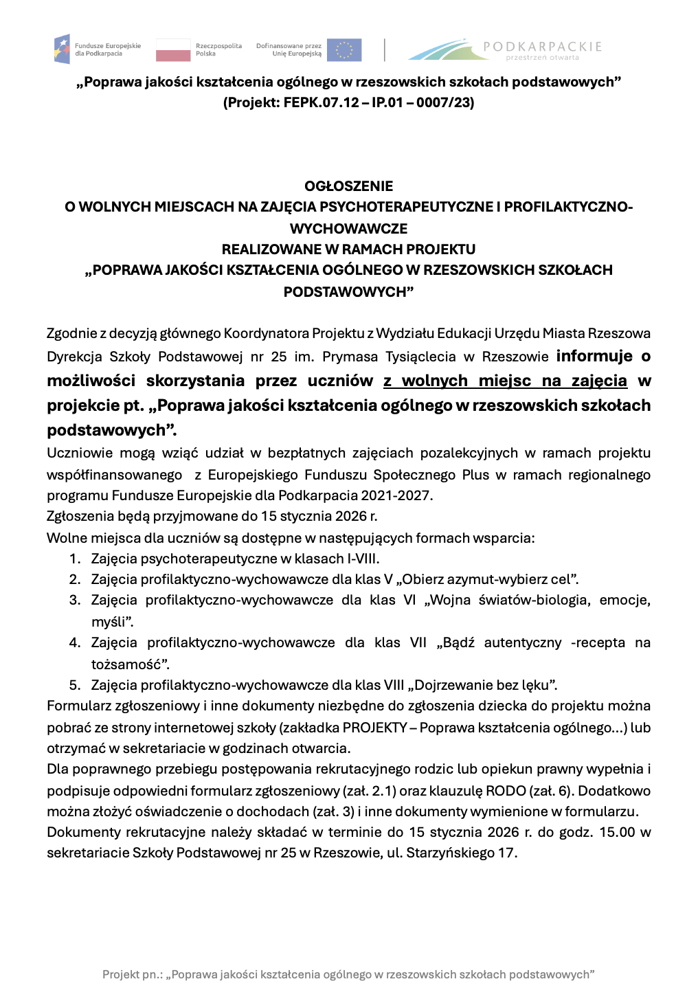 Zgodnie z decyzją głównego Koordynatora Projektu z Wydziału Edukacji Urzędu Miasta Rzeszowa Dyrekcja Szkoły Podstawowej nr 25 im. Prymasa Tysiąclecia w Rzeszowie wydłuża termin rekrutacji 2025 do projektu „Poprawa jakości kształcenia ogólnego w rzeszowskich szkołach podstawowych”.